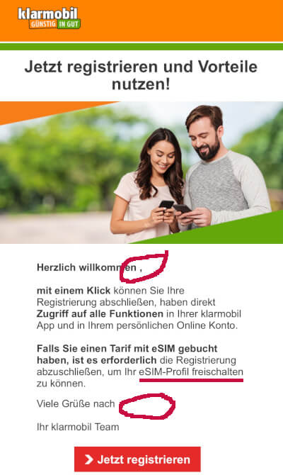 Klarmobil scheitert bereits daran E-Mail Templates korrekt mit Platzhaltern ausfüllen zu lassen. Beim Versand der „Registrierung bestätigen“ E-Mail für den Online-Service fehlen der Name in der Anrede und der Ort. Naja, halb so wild. Leider weit gefehlt. Denn in der gleichen E-Mail muss die Registrierung für die Klarmobil Online-Services mit einem Klick auf den „Jetzt registrieren“ Button abgeschlossen werden. Der hier hinterlegte Link ist aber falsch. Das heißt Kunden können ihre Registrierung nicht abschließen und damit die Klarmobil Online-Services nicht nutzen. Dummer Weise muss hier aber die eSIM frei geschaltet (Abruf des Profils per QR-Code Scan) werden. Ohne geht’s nicht, die Klarmobil eSIM lässt sich damit nicht aktivieren!!