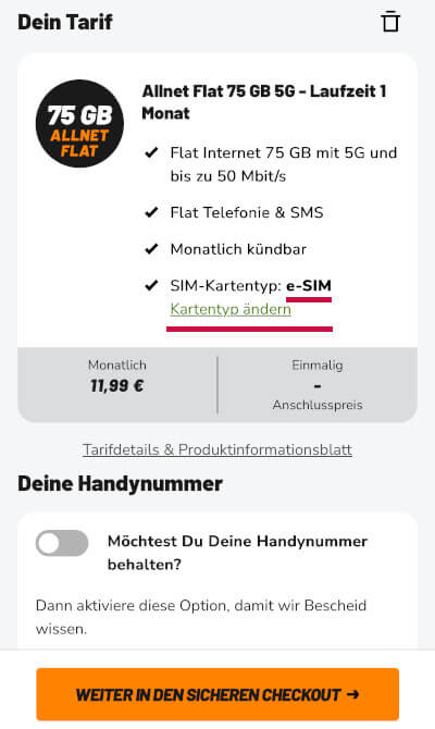 Bestellt habe ich die Klarmobil eSIM ganz normal über die Webseite des Anbieters. Die digitale SIM-Karte musste hier im Buchungsprozess manuell ausgewählt werden. Voreingestellt war die klassische Plastik-SIM Karte. Um zu testen wie lange die reine eSIM Aktivierung im besten Fall dauert habe ich eine neue Rufnummer genutzt, da der Portierungsprozess bei Mitnahme einer bestehenden Handynummer erfahrungsgemäß bis zu 2 Wochen dauern kann.